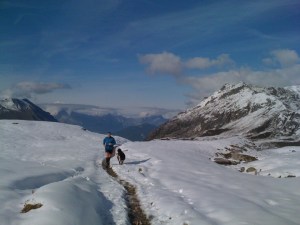 This is a photo taken yesterday by Sarah of me with Maximus, running up to the Col du Bonhomme, one of the high passes on the Tour du Mont Blanc. As you can see, there was a beautiful coating of fresh snow on the ground from 1800m upwards, so things got a bit interesting higher up. As anyone who has been snowshoeing with us will know, Max is quite a big fan of the snow, so was in heaven. Literally his Christmas had come early! You can see photos of this great day out at; http://picasaweb.google.com/FatMarmotSnowshoeing/TMBInAutumn